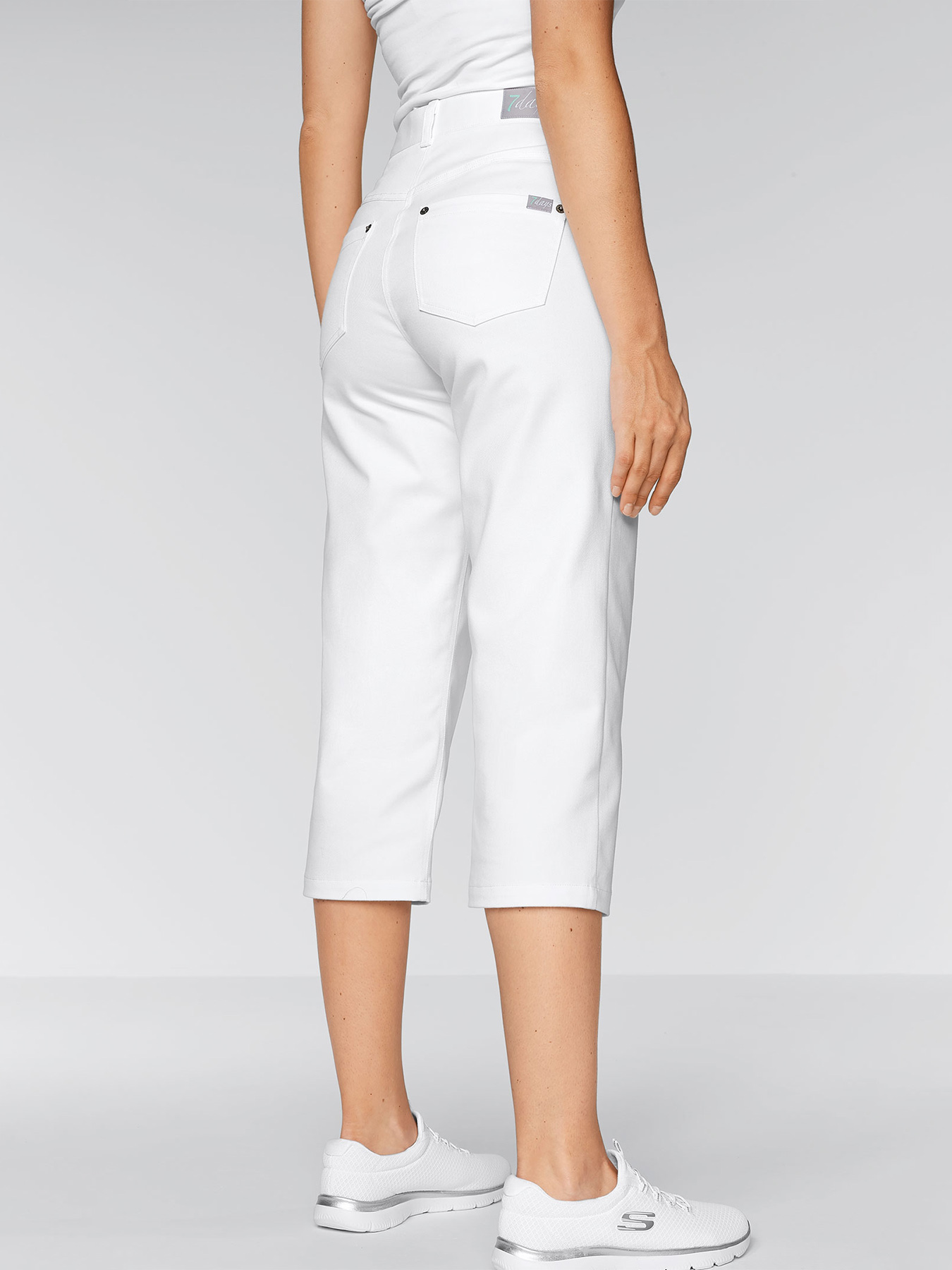 Moderne 7/8-Stretchjeans mit Gürtelschlaufen und hoher Leibhöhe. Bequemes, weites Bein, 2 Taschen vorne + 2 Gesäßtaschen. Schrittlänge ca. 54cm, 64% Baumwolle/35% Polyester/1% Elasthan, 60°-Wäsche.