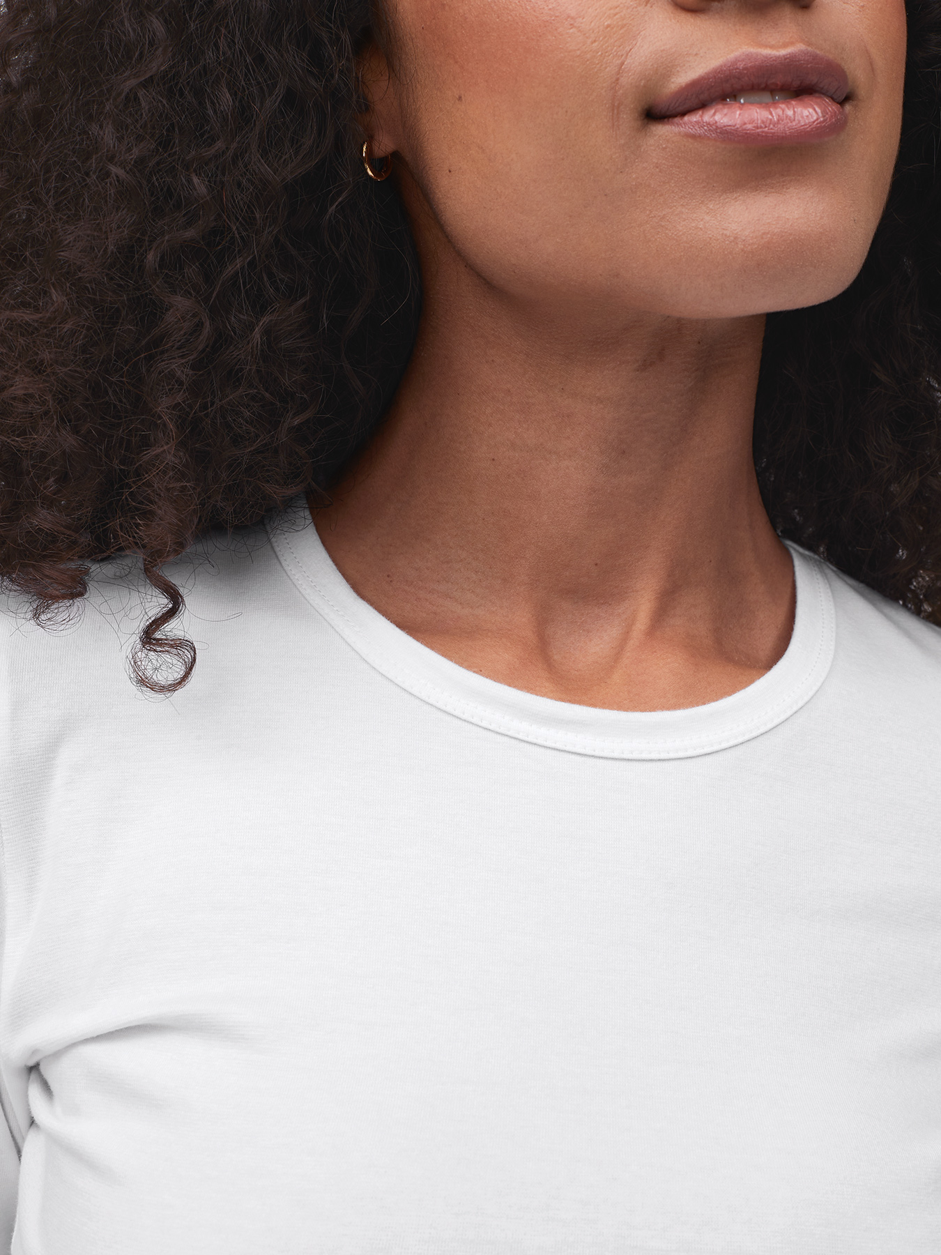 Rundhalsausschnitt, ¾-Arm, körpernah geschnitten, Rückenlänge bei Gr. S ca. 64 cm. Weiche, formstabile Qualität aus 94% Baumwolle/6% Elasthan, 200 g/m², Single Jersey, 60°-Wäsche.