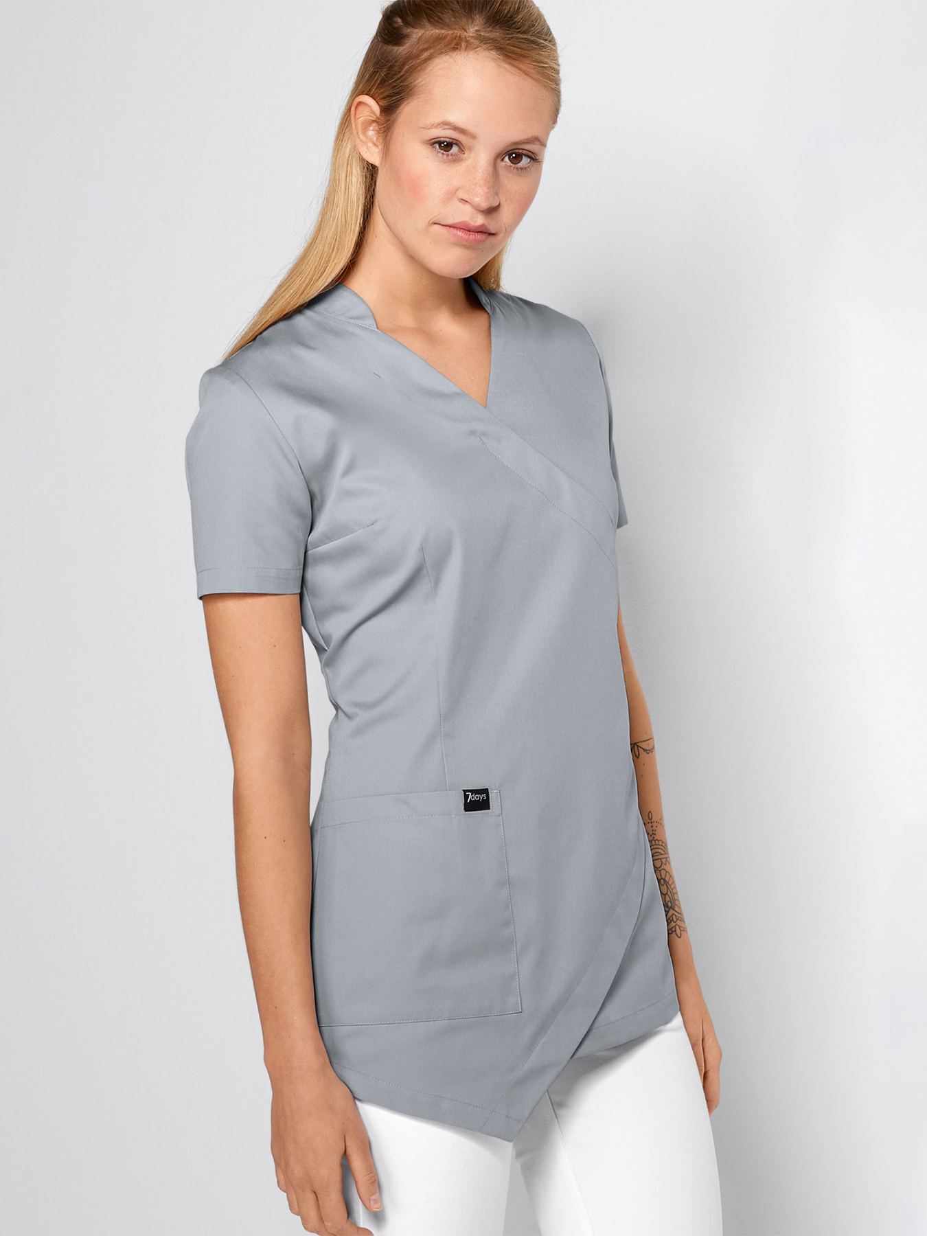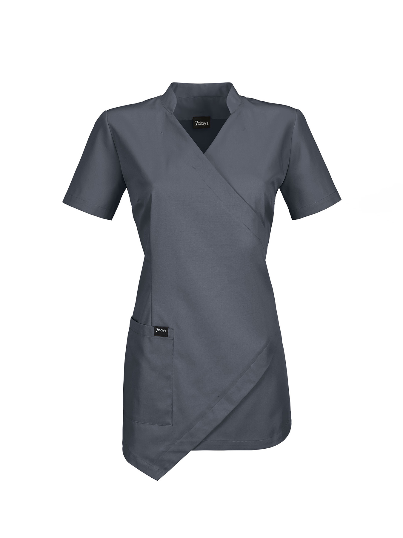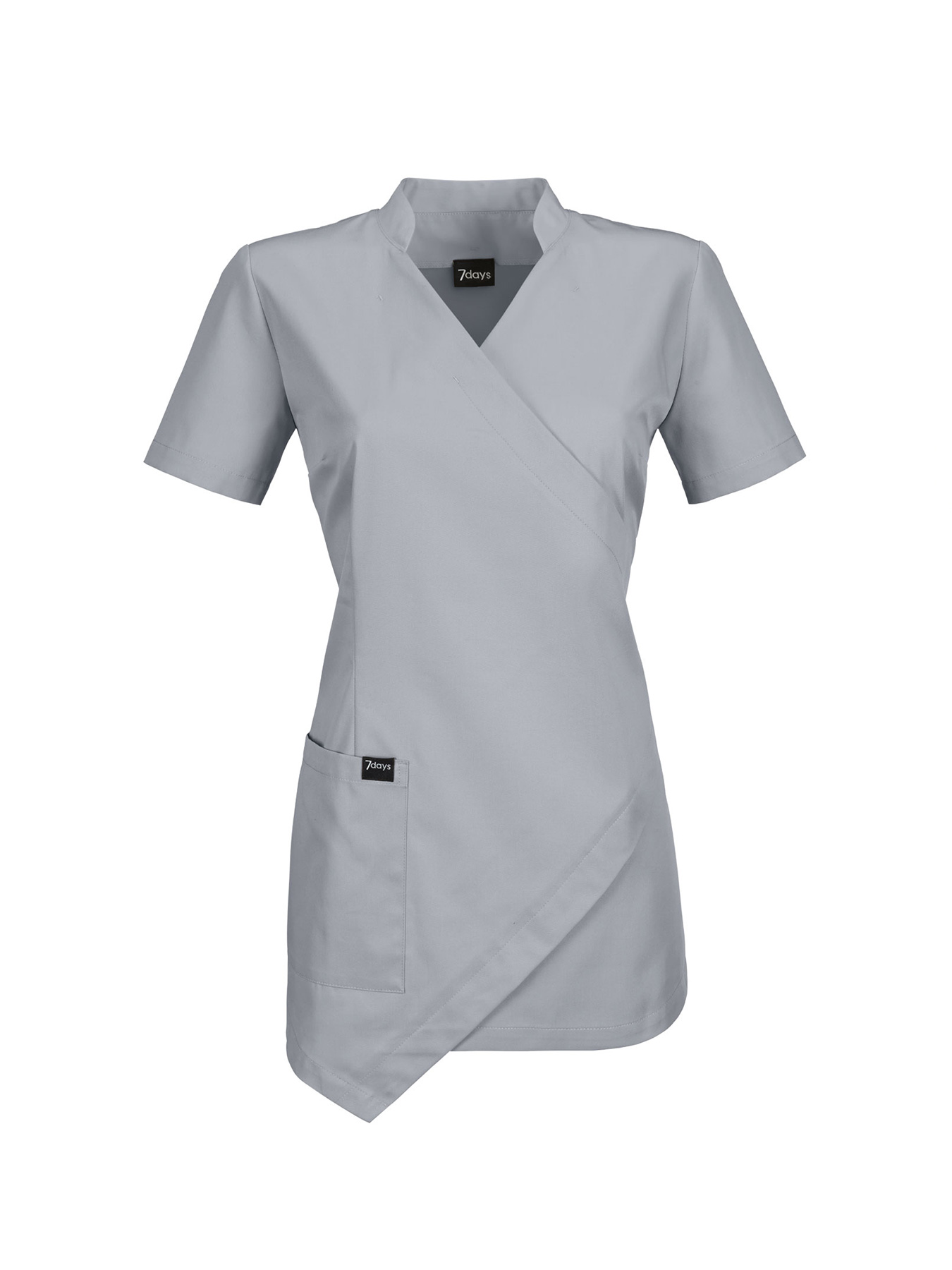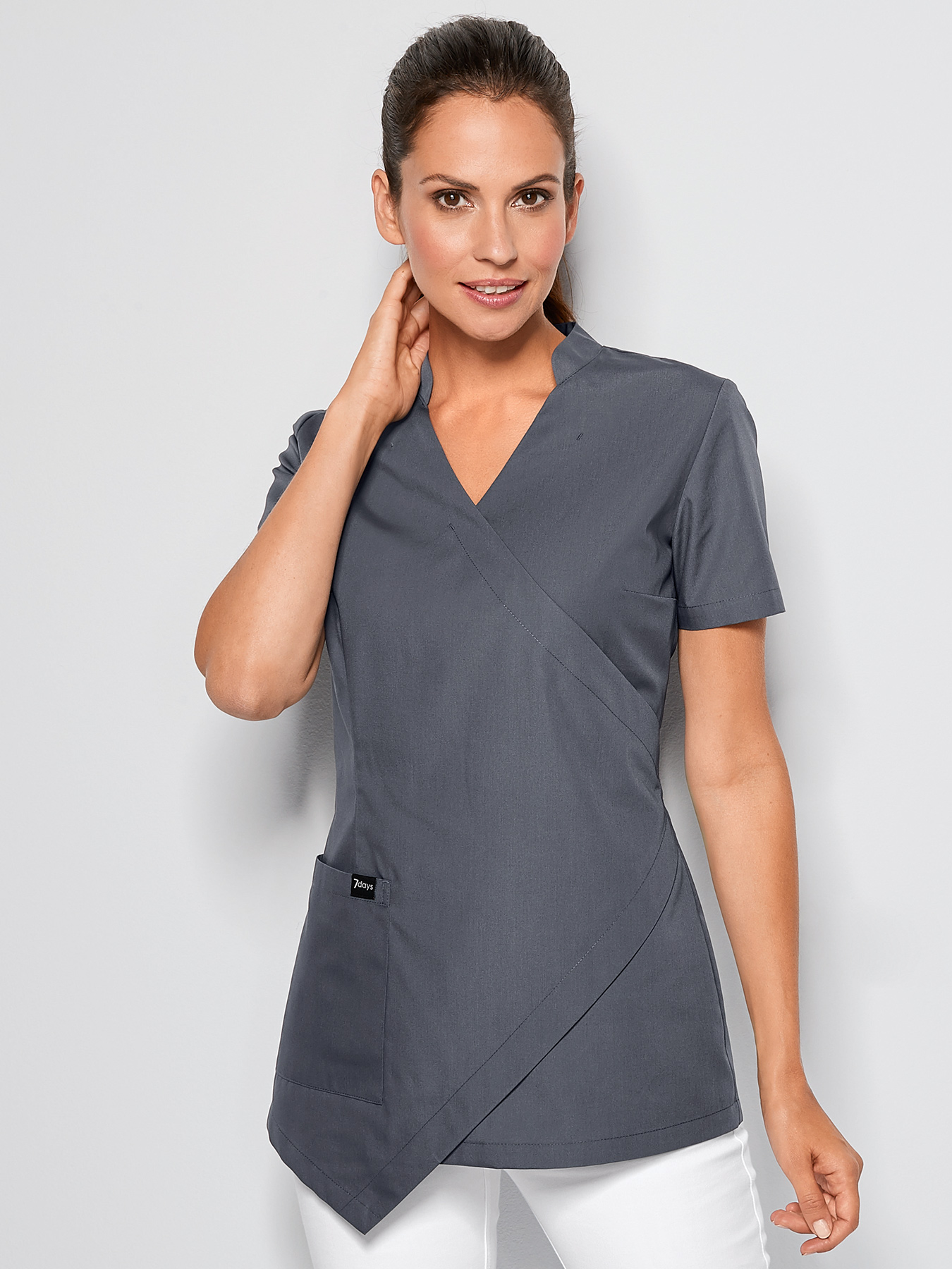 Eleganter Schlupfkasack in Wickeloptik mit kleinem Stehkragen. V-Ausschnitt, ¼-Arm, 1 Tasche, figurbetonende Abnäher, asymmetrischer Saum, Rückenlänge Gr. S ca. 70 cm. Weiß = 65% Polyester/35% Baumwolle, 195 g/m², Farben = 50% Polyester/50% Baumwolle, 150 g/m2, 95°-Wäsche, außer blue curacao 60°-Wäsche, nicht chlorbar, alle Farben trocknergeeignet, Webware.