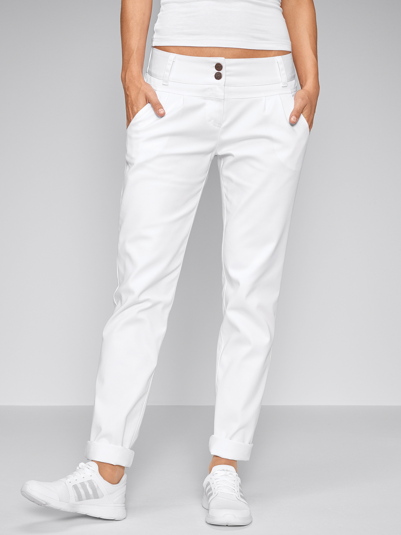 Breiter Komfortbund mit Gummieinsatz im hinteren Bund, Gürtelschlaufen, Bundfalten vorne, etwas niedrigere Leibhöhe, 5-Pocket mit seitlichen Einschubtaschen vorne, Passennaht hinten, bequeme Weite mit enger werdender Fußweite. Knitterarme und bügelleichte Qualität aus 64% Baumwolle/35% Polyester/1% Elasthan, 300 g/m2, Stretchware, 60°-Wäsche.