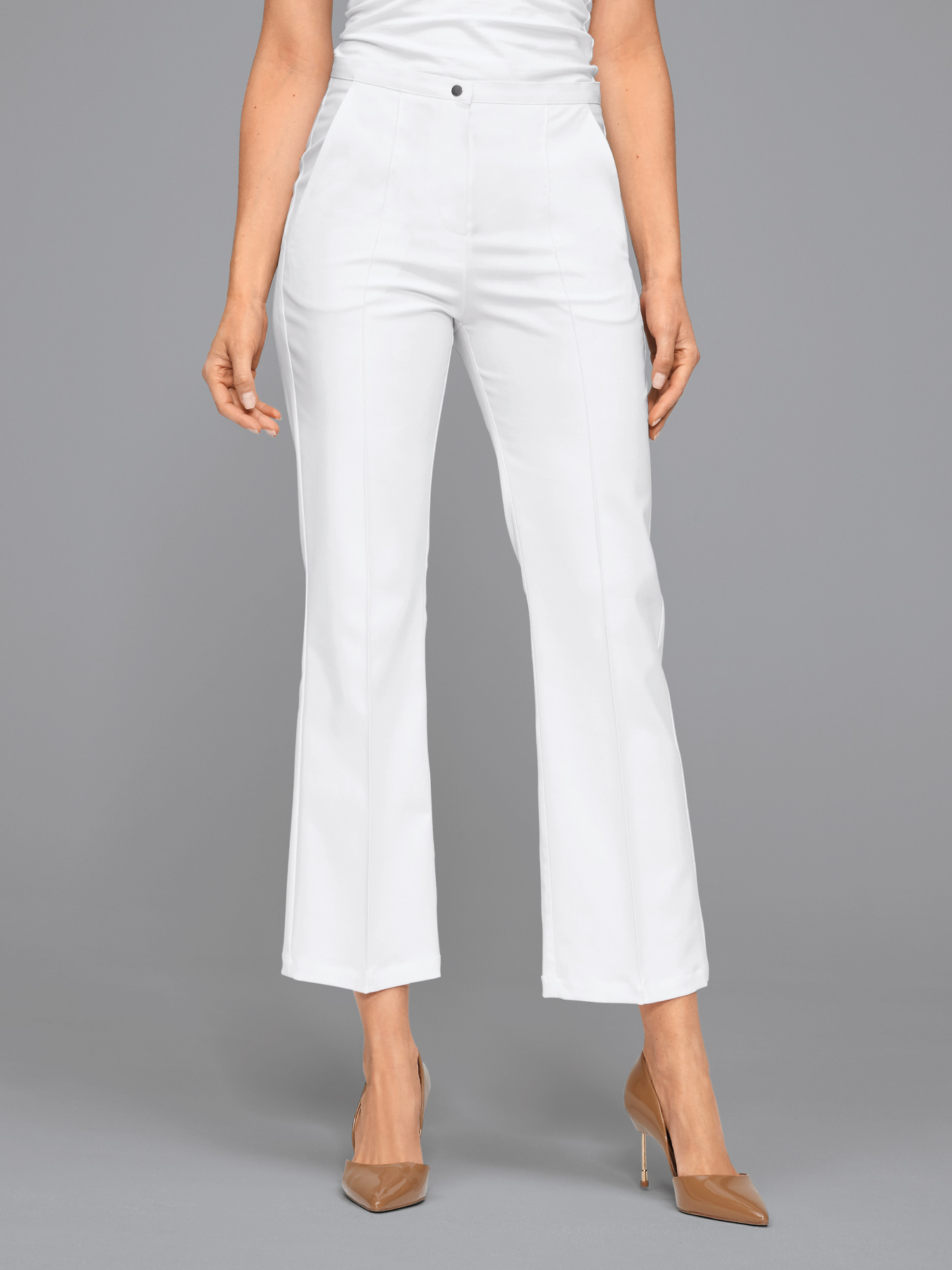 Aus der 7days Selection Kollektion:Hochwertige ⅞ Damen-Stretchhose. Temperaturausgleichender TENCEL™ Faseranteil für hohen Tragekomfort. Satinband am Bund innen, 2 Eingrifftaschen vorne, 2 Leistentaschen hinten, hohe Leibhöhe, gerade geschnittenes Bein mit Biesennaht vorne, Passennaht hinten für eine wunderschön geformte Silhouette. Schrittlänge ca. 69 cm.  48% Lyocell (TENCEL™)/48% Polyester/4% Elastolefin. Weiß = 260 g/m², 60°-Wäsche, trocknergeeignet. TENCEL™ ist eine Marke der Lenzing AG.