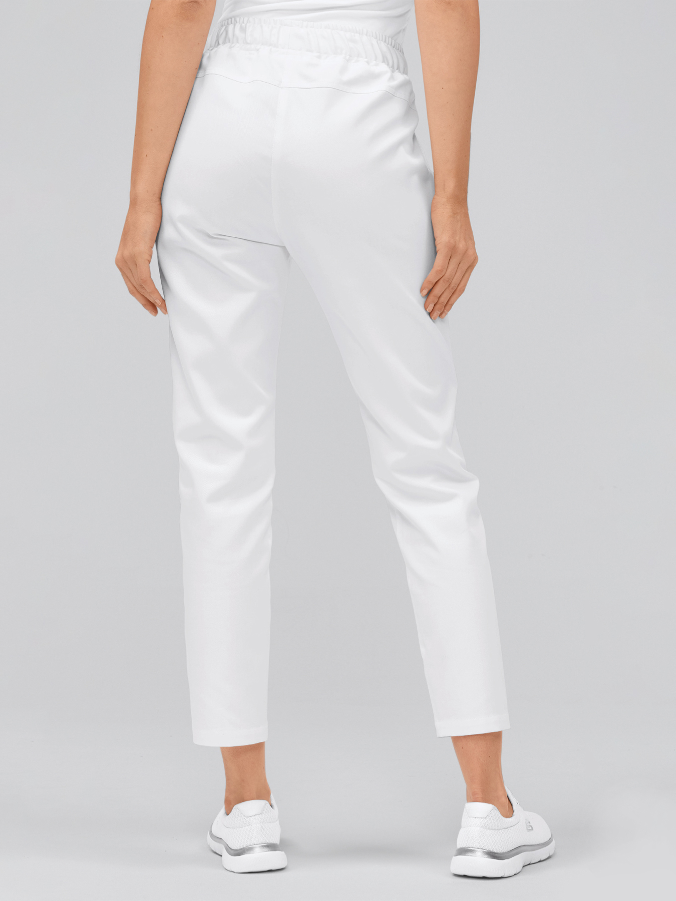 Damenhose mit Rundumgummibund, 2 Einschubtaschen, hohe Leibhöhe, bequeme Oberschenkelweite mit schmaler werdendem Bein. Schrittlänge ca. 70 cm. In 2 Qualitäten: 100% Baumwolle, 210 g/m2 und 65% Polyester/35% Baumwolle, 195 g/m2, 95°-Wäsche, Industriewäsche geeignet nach EN ISO 15797, trocknergeeignet, nicht blickdicht.