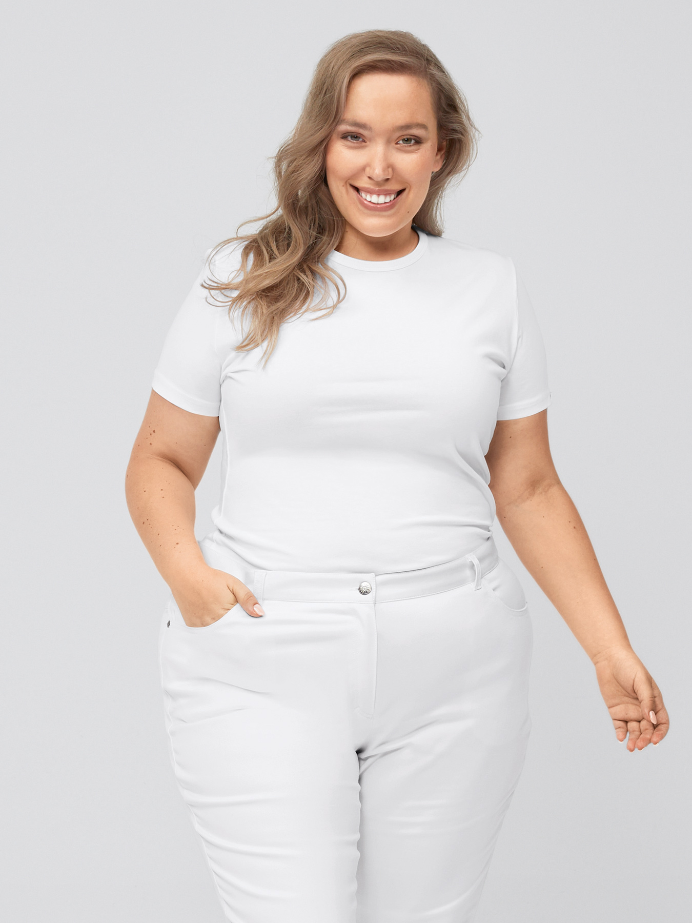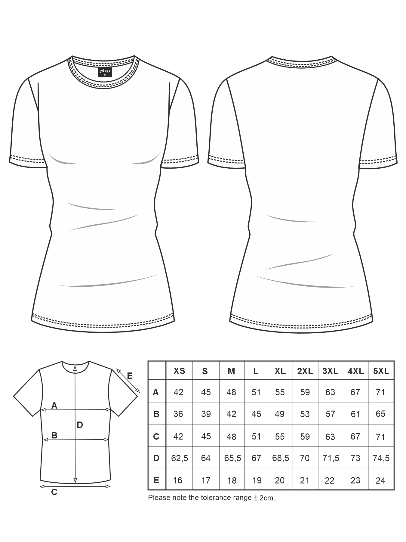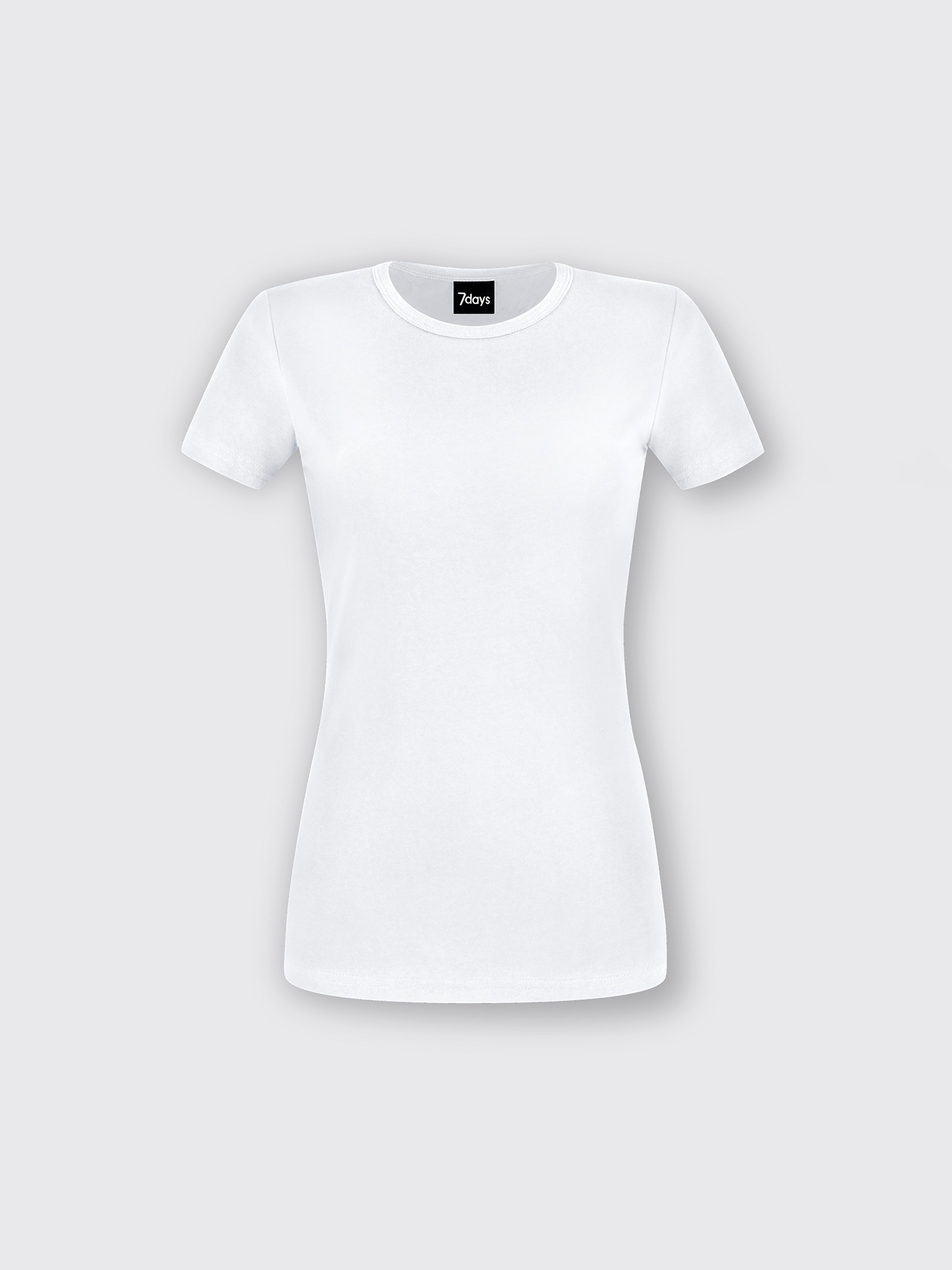 Damenshirt, Kurzarm mit Rundhalsausschnitt, Rückenlänge Gr. S ca. 64 cm, slim fit. 94% Baumwolle/6% Elasthan, 200 g/m², außer weiß, marine + schwarz = 95% Baumwolle/5% Elasthan, 180 g/m2, Single Jersey, 60°-Wäsche.