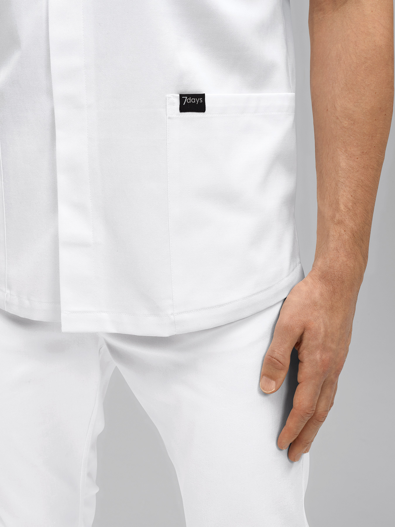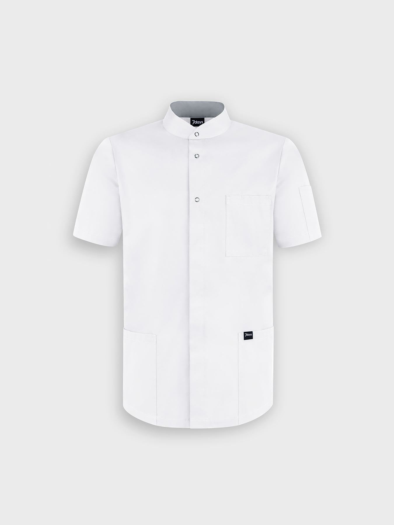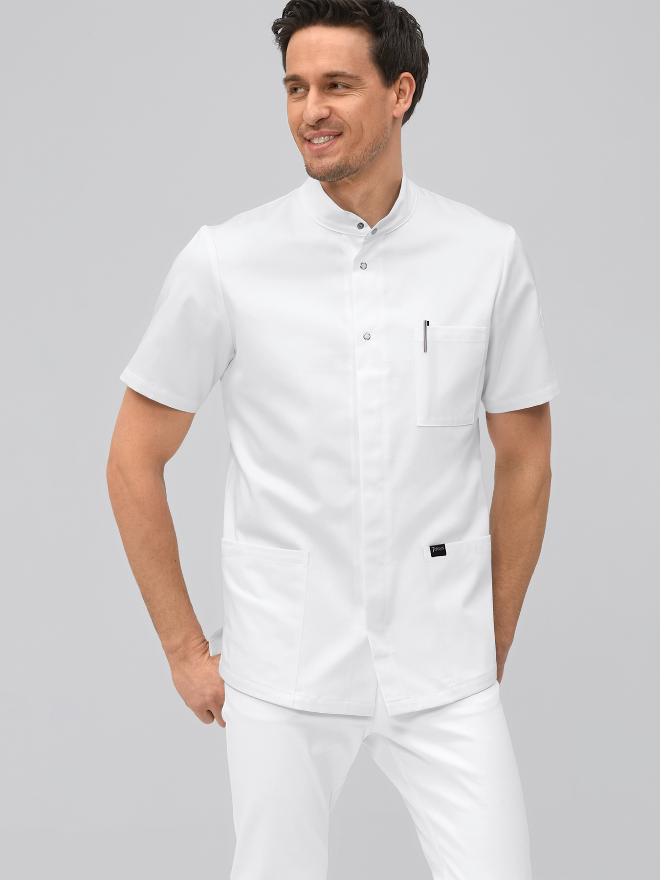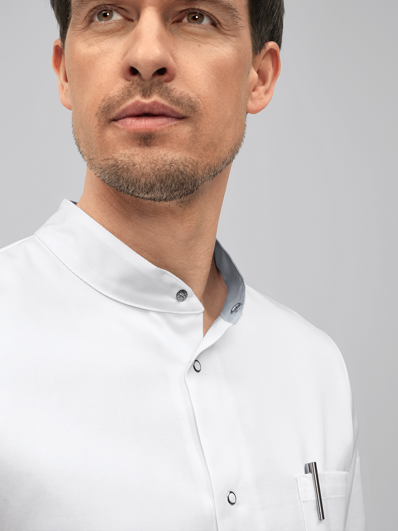 Sportlicher Herrenkasack mit verdeckter Druckknopfleiste. Modern fit, Stehkragen mit kontrastfarbener Innenseite, 1 Brusttasche mit abgetrennter Kulitasche, 2 große Einschubtaschen, 1 kleine Tasche am Ärmel. Bequeme Seitenschlitze, Rückenlänge Gr. M ca. 74 cm. 100 % Baumwolle, 95°-Wäsche, chlorbar, trocknergeeignet.