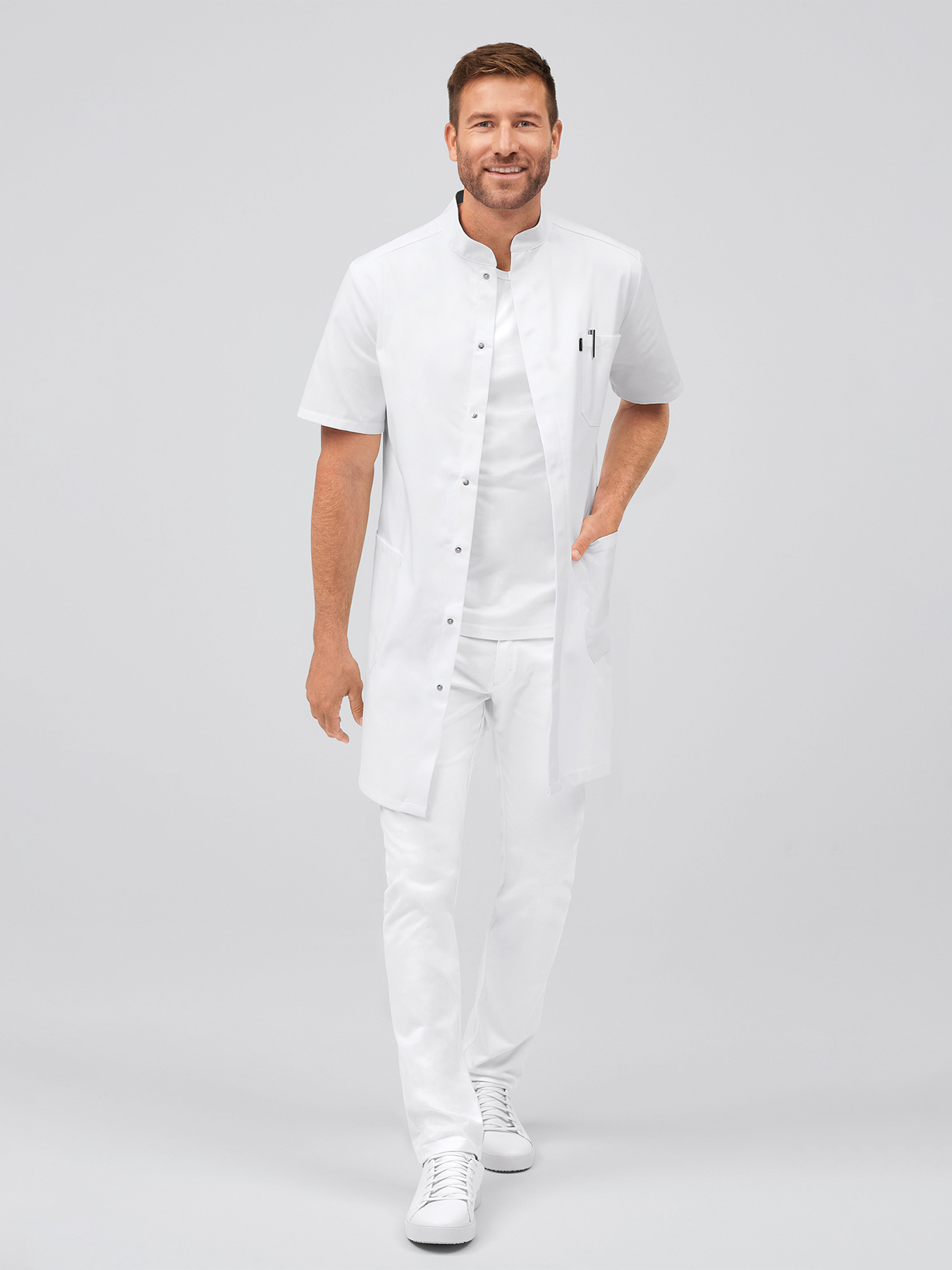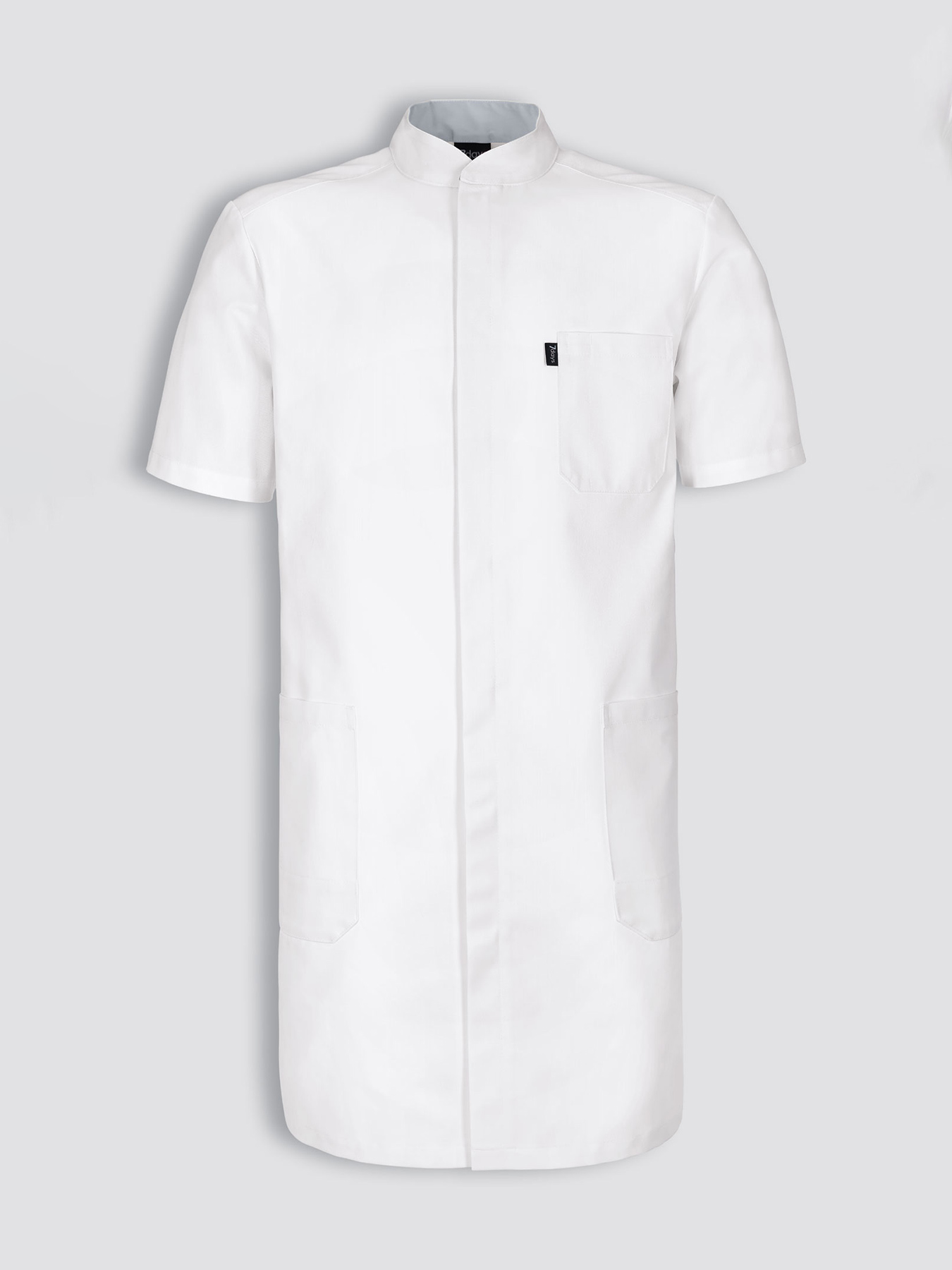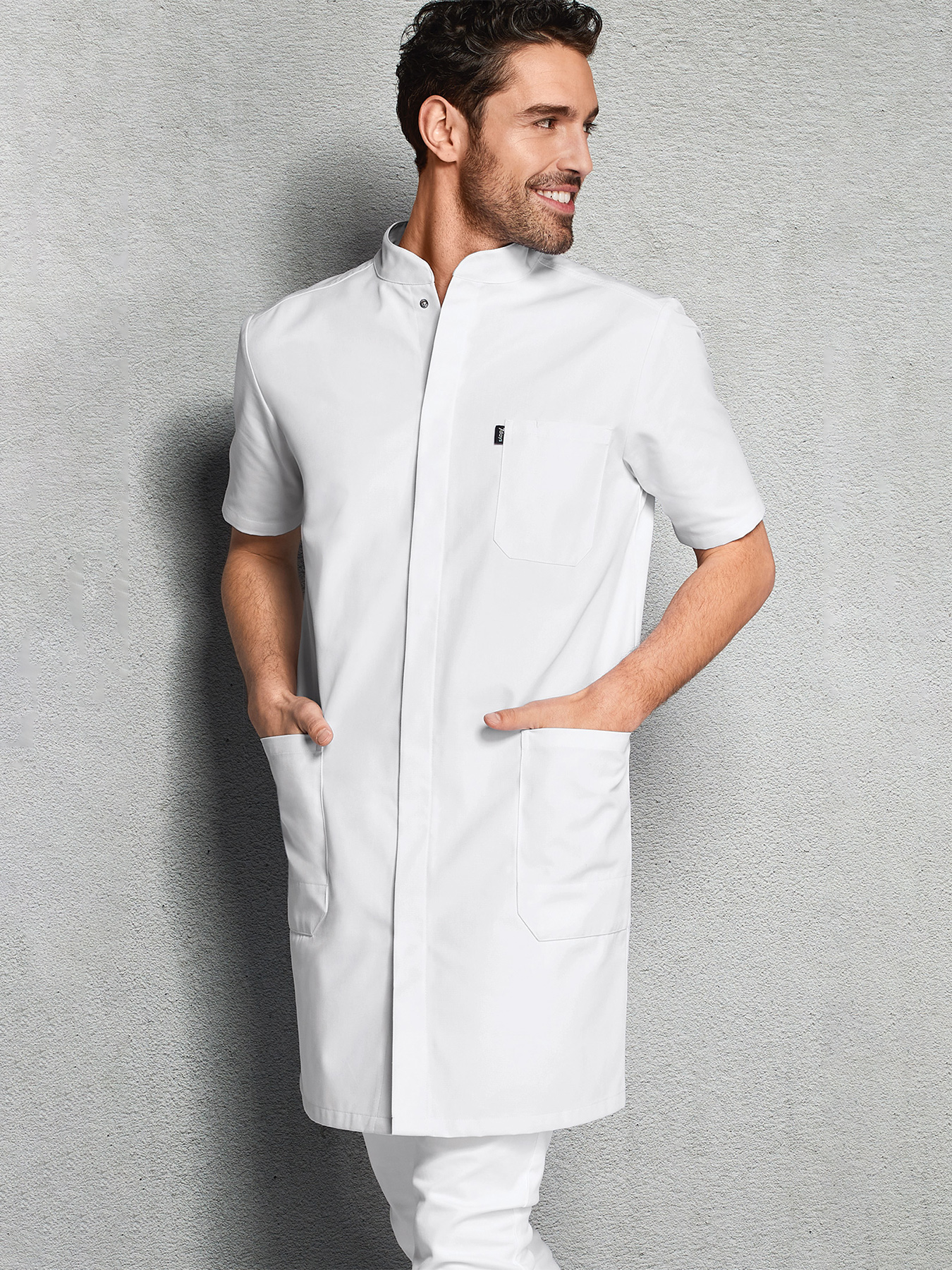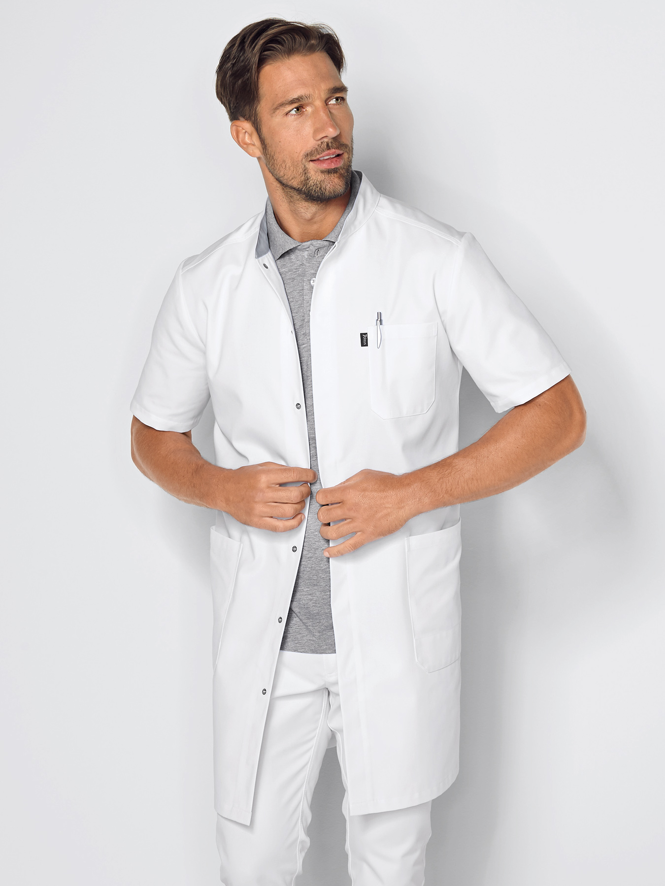 Kurzarmmantel mit Stehkragen und verdeckter Druckknopfleiste. Kontrastfarbener Innenkragen, 1 Brusttasche mit abgetrennter Kugelschreibertasche, 2 große Taschen, rückwärtiger Gehschlitz, Rückenlänge Gr. M ca. 96 cm. 65% Polyester/35% Baumwolle, 245 g/m2, feste Webware, 95°-Wäsche, trocknergeeignet. Die Lieferung erfolgt ohne weiteres, abgebildetes Zubehör.