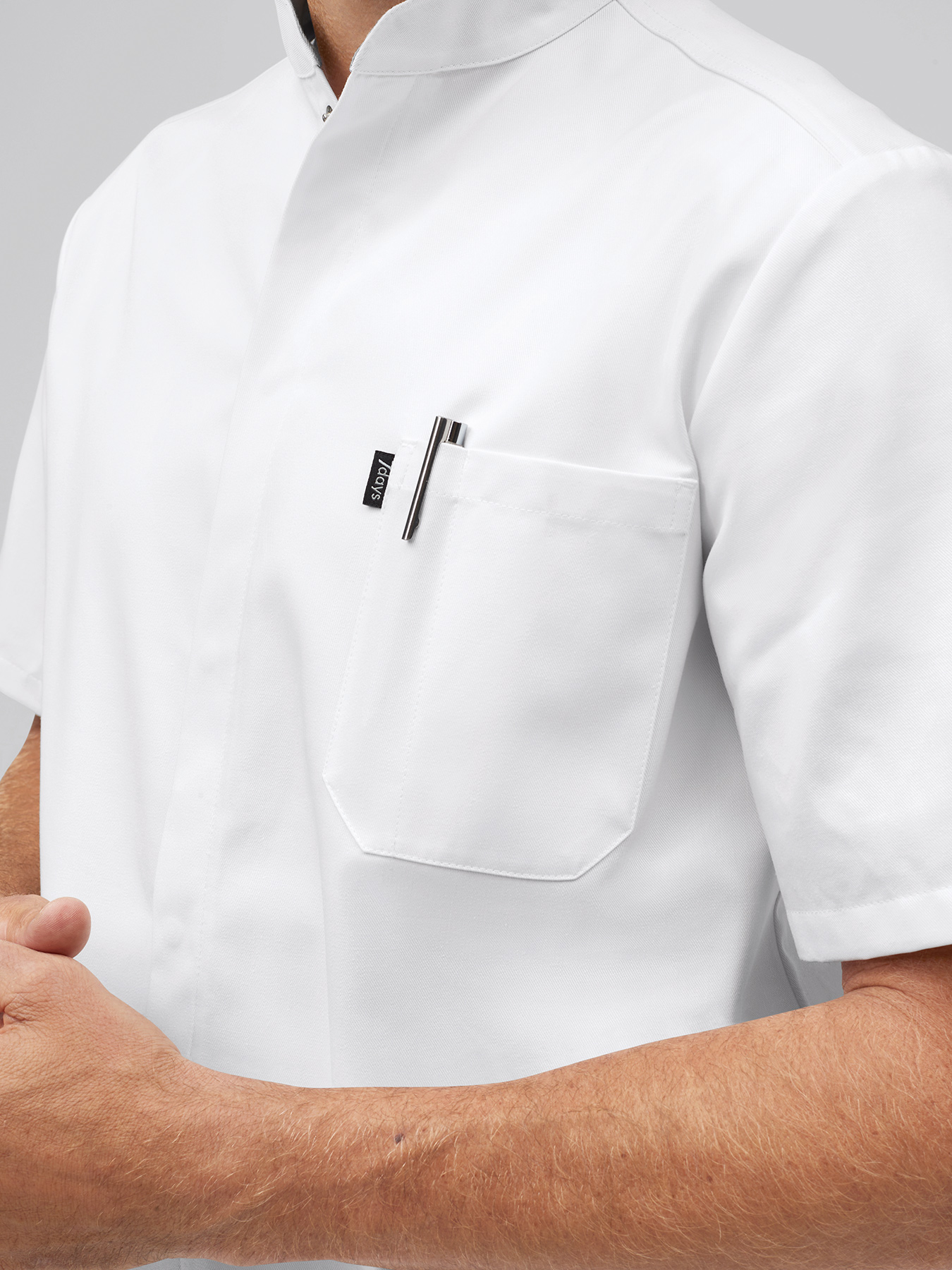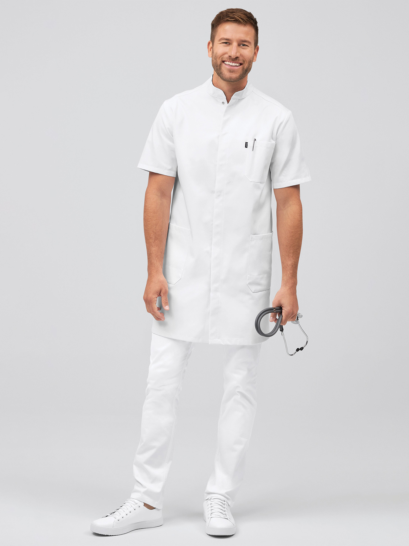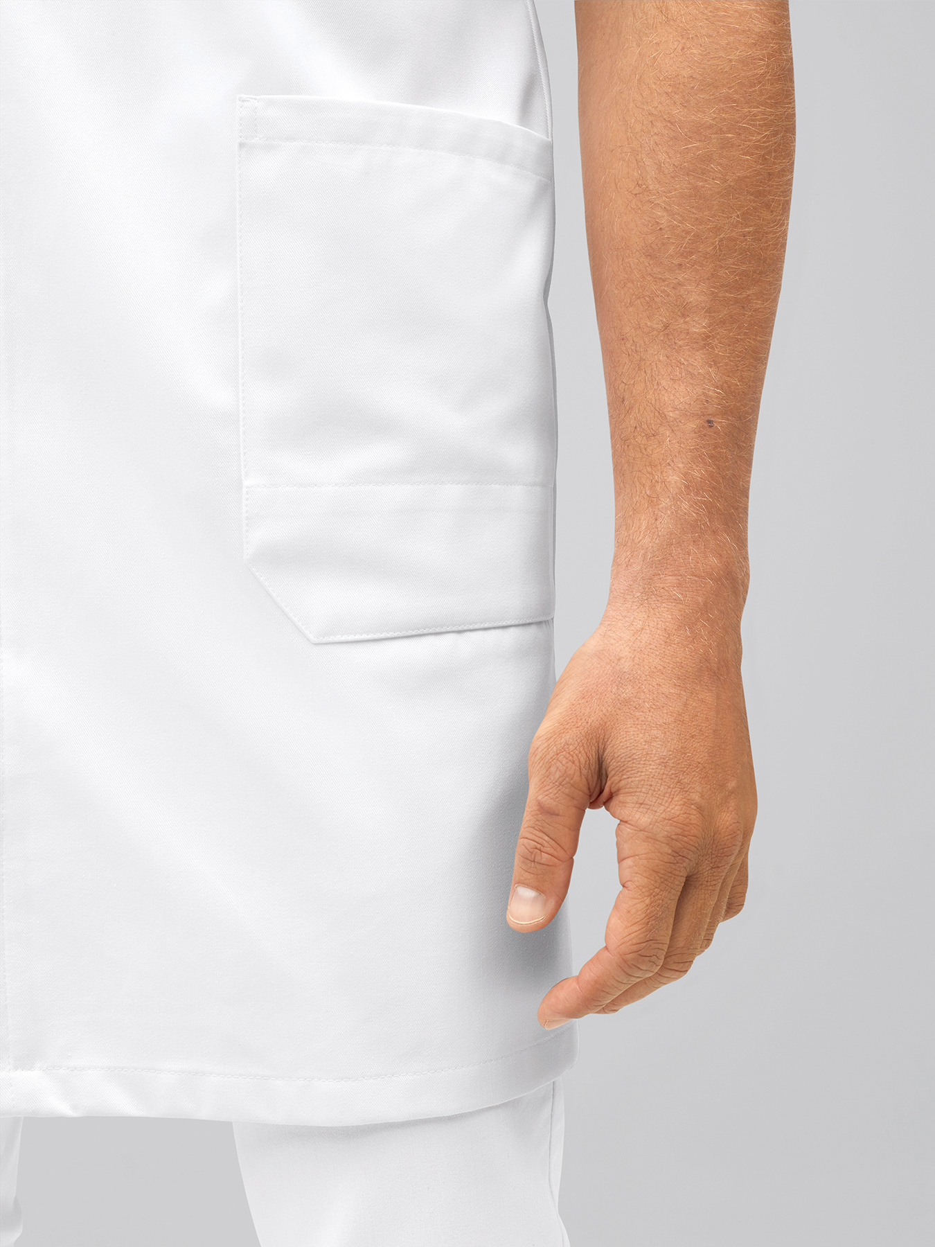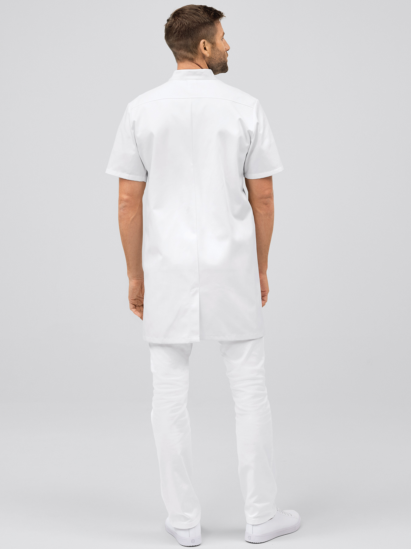 Kurzarmmantel mit Stehkragen und verdeckter Druckknopfleiste. Kontrastfarbener Innenkragen, 1 Brusttasche mit abgetrennter Kugelschreibertasche, 2 große Taschen, rückwärtiger Gehschlitz, Rückenlänge Gr. M ca. 96 cm. 65% Polyester/35% Baumwolle, 245 g/m2, feste Webware, 95°-Wäsche, trocknergeeignet. Die Lieferung erfolgt ohne weiteres, abgebildetes Zubehör.