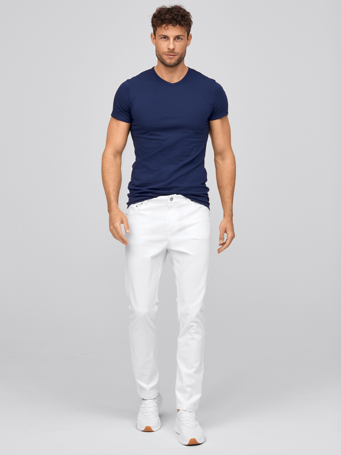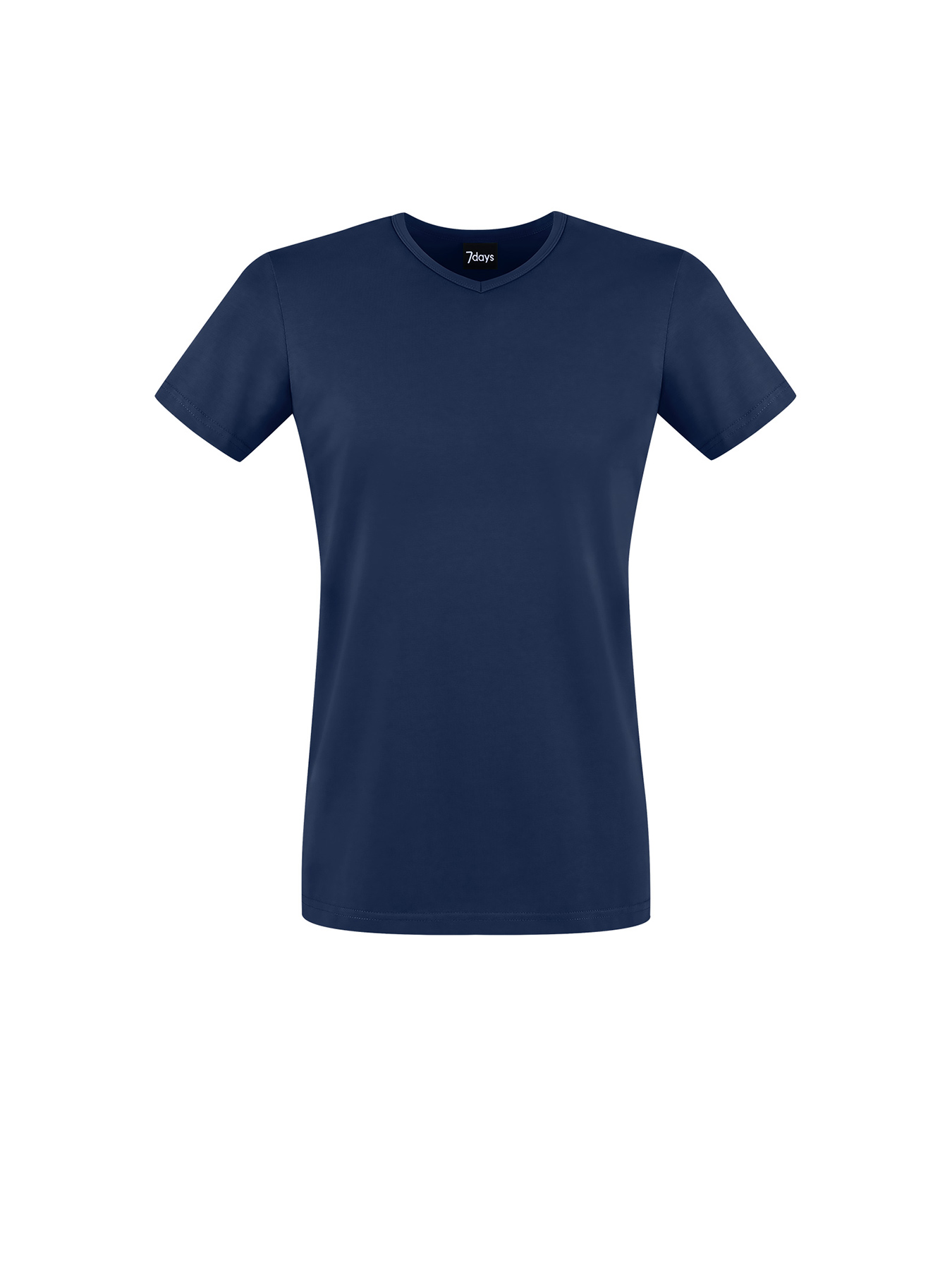 Herrenshirt, V-Ausschnitt, Kurzarm, Rückenlänge Gr. M ca. 71 cm, slim fit. Marine und weiß = 94% Baumwolle/6% Elasthan, 200 g/m², oliv = 95% Baumwolle/5% Elasthan, 180 g/m2, Single Jersey, 60°-Wäsche.
