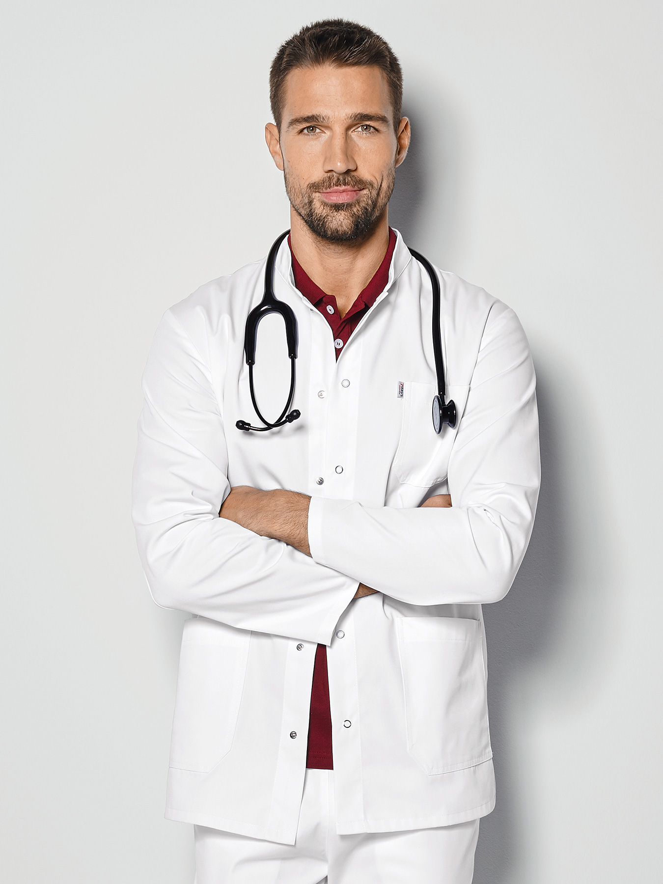 Langarm, Stehkragen, Druckknöpfe, 1 Brust-, 2 Eingrifftaschen, Rückenlänge bei Gr. 50 ca. 81 cm. 65% Polyester/35% Baumwolle, Webware, 60°-Wäsche.