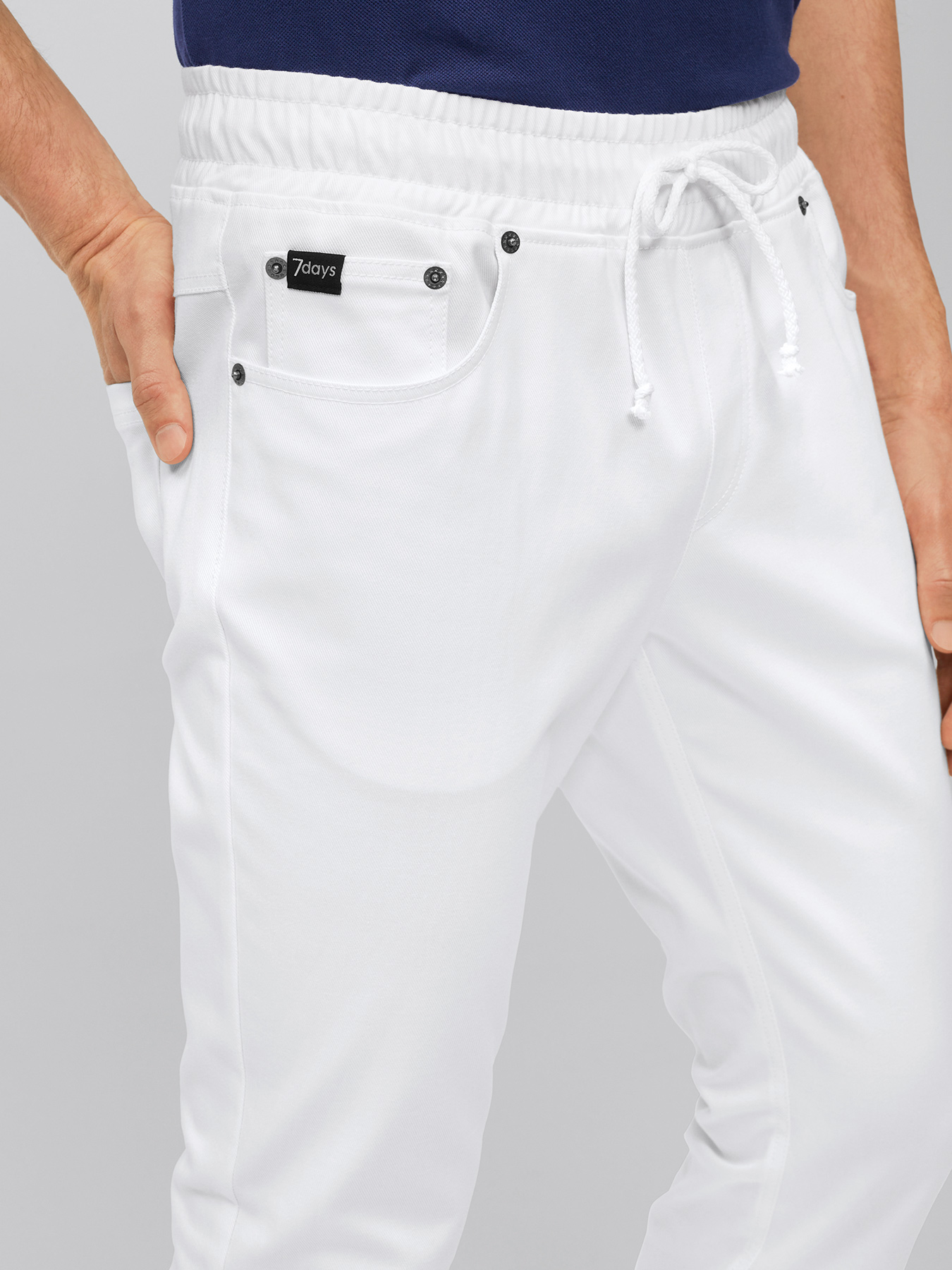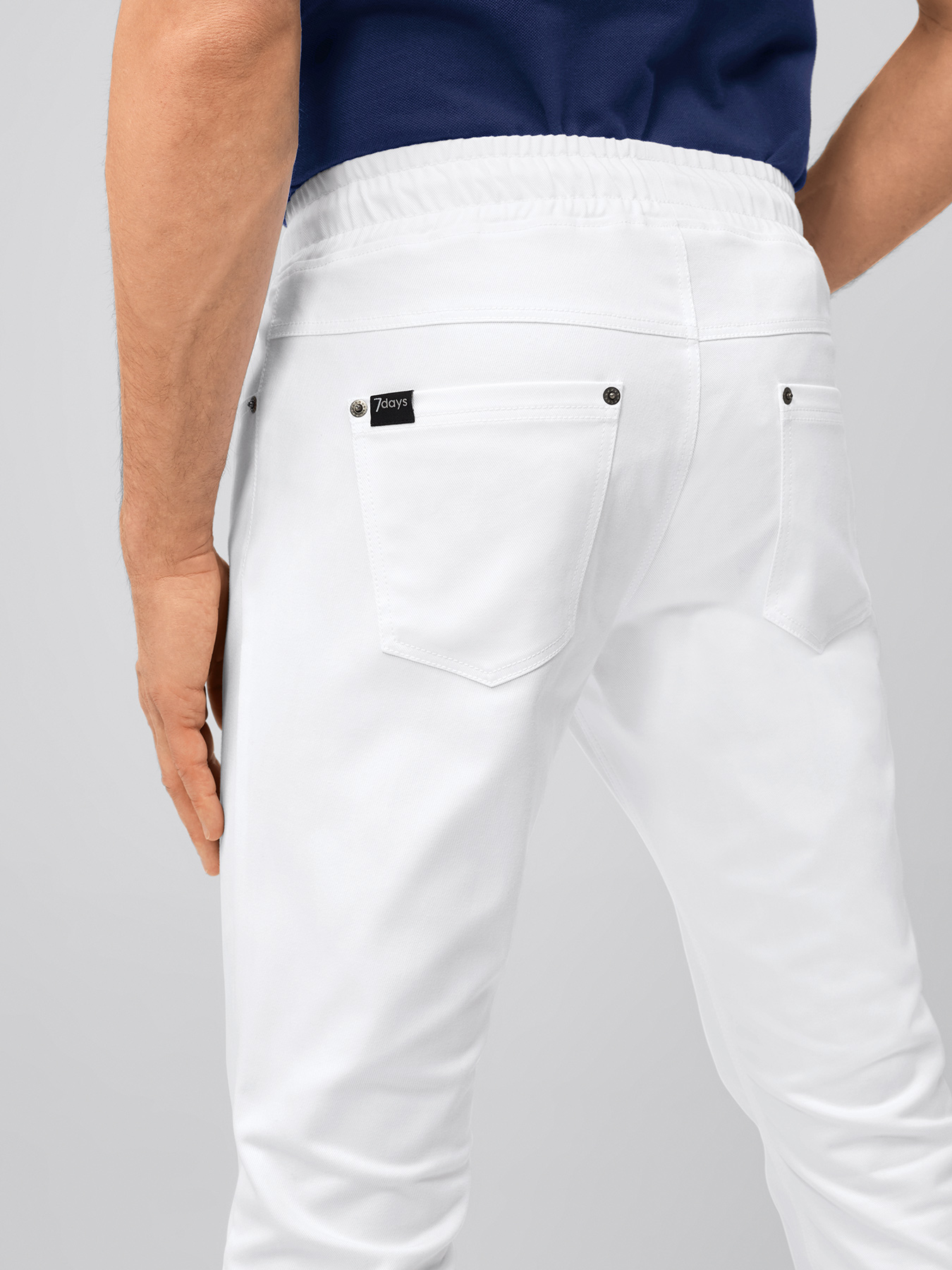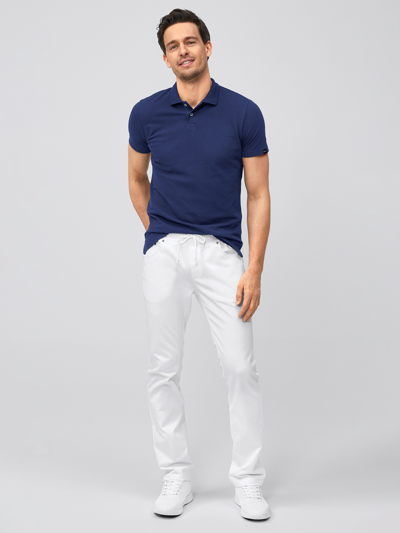 Moderne Arzthose im 5-Pocket-Style mit Gummibund und Kordeltunnelzug, regular fit. Etwas niedrigere Leibhöhe und schmal zulaufendes Bein, Schrittlänge ca. 84 cm. Knitterarme und bügelleichte Qualität aus 64% Baumwolle/35% Polyester/1% Elasthan, 300 g/m2, 60°-Wäsche.