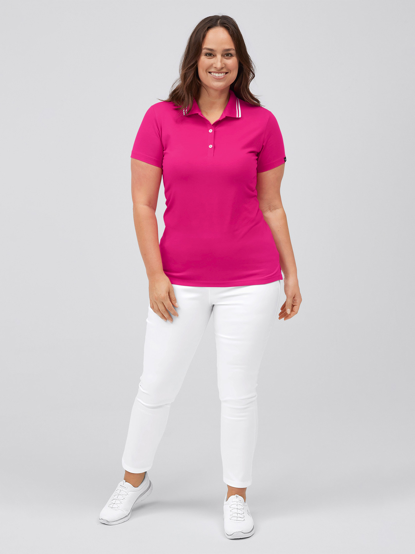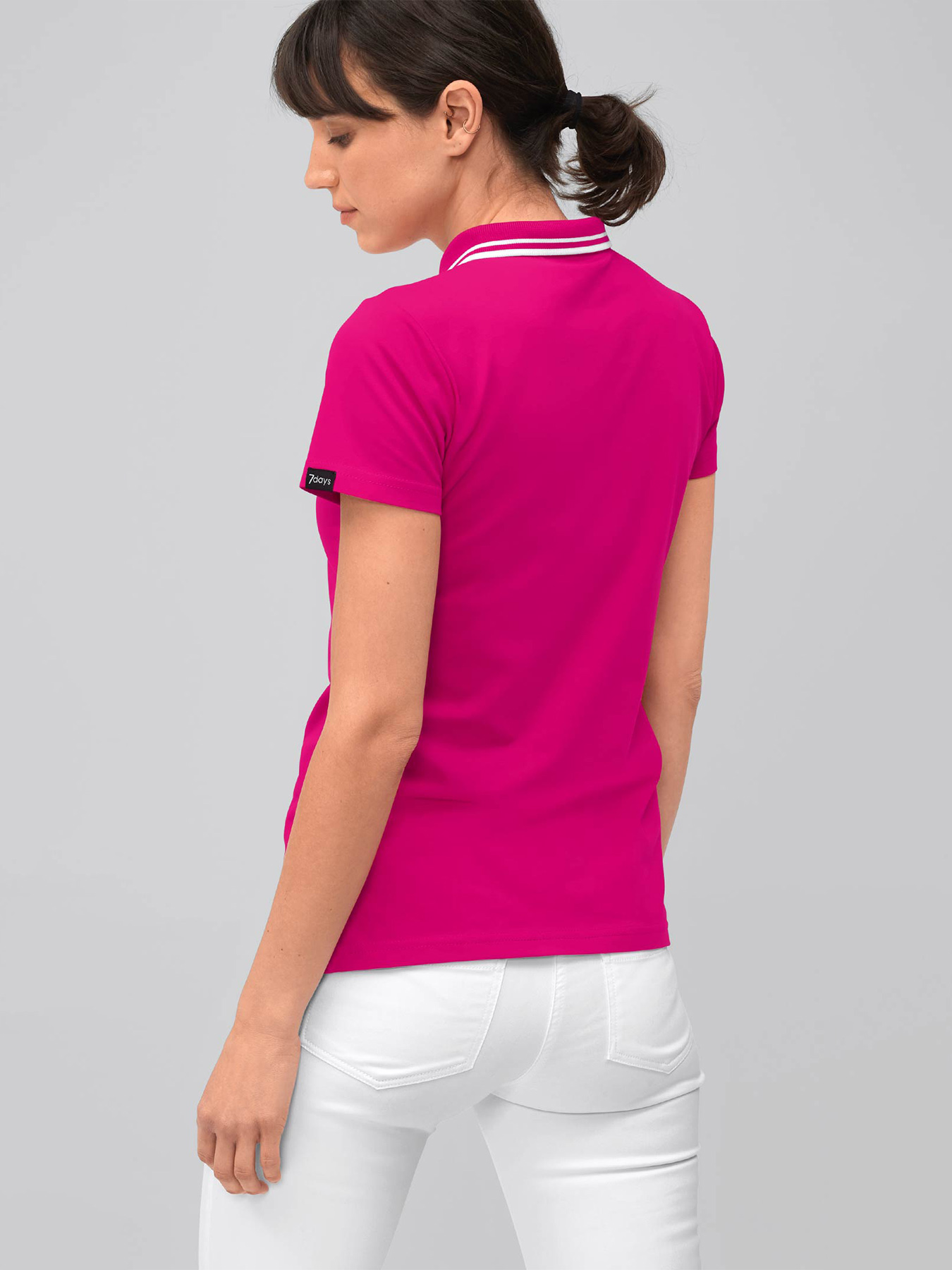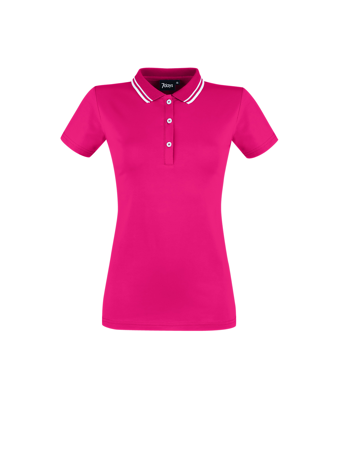 Figurbetonendes Damen-Poloshirt, 3-Loch-Knopfleiste, Strickkragen mit weißen Streifen, ¼-Arm, Seitenschlitze. Rückenlänge Gr. S ca. 65 cm. Formstabile und elastische Qualität aus 95% Baumwolle/5% Elasthan, 180 g/m2, Single Jersey, 60°-Wäsche.