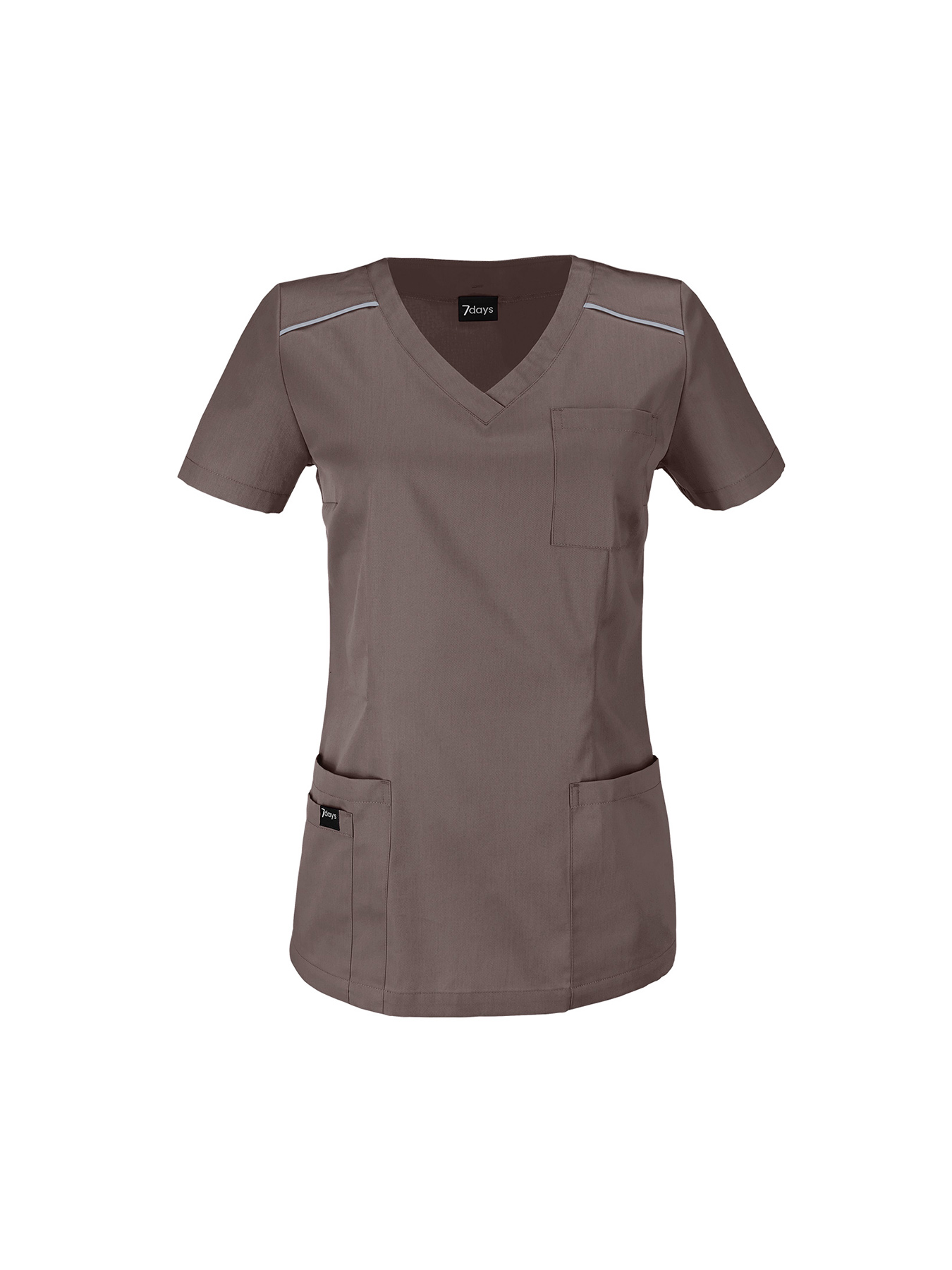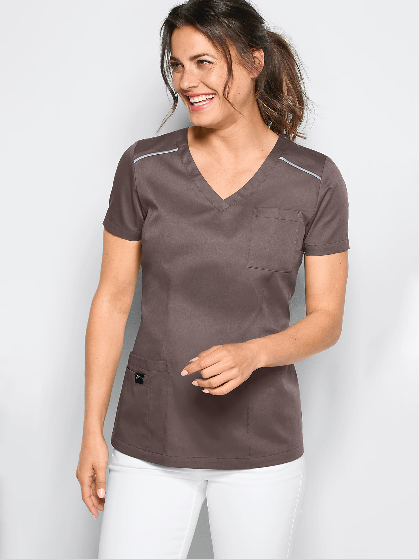 Leicht taillierter Schlupfkasack mit V-Ausschnitt, 1 aufgesetzte Brusttasche, 3 Eingrifftaschen, kontrastfarbige Paspelnähte im Vorderteil, Rückenlänge Gr. S ca. 66 cm, slim fit. Weiß = 65% Polyester/35% Baumwolle, 195 g/m², Farben = 50% Polyester/50% Baumwolle, 150 g/m², 95°-Wäsche, außer blue curacao 60°-Wäsche, nicht chlorbar. Alle Farben trocknergeeignet. Die Lieferung erfolgt ohne weiteres, abgebildetes Zubehör.