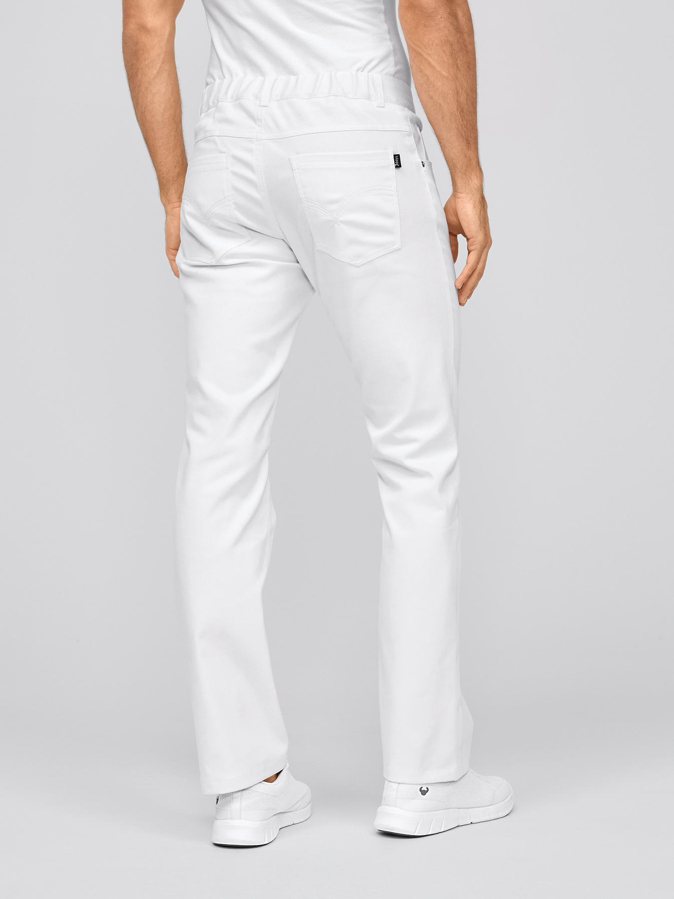 5-Pocket-Form, normale Leibhöhe, Komfortbund durch Gummieinsatz im hinteren Bund, gerade geschnittenes Bein, bequeme Weite, Stickerei auf Gesäßtaschen. Schrittlänge ca. 83 cm. Knitterarme und bügelleichte Qualität aus 64% Baumwolle/35% Polyester/1% Elasthan, 300 g/m2, Stretchware, 60°-Wäsche.
