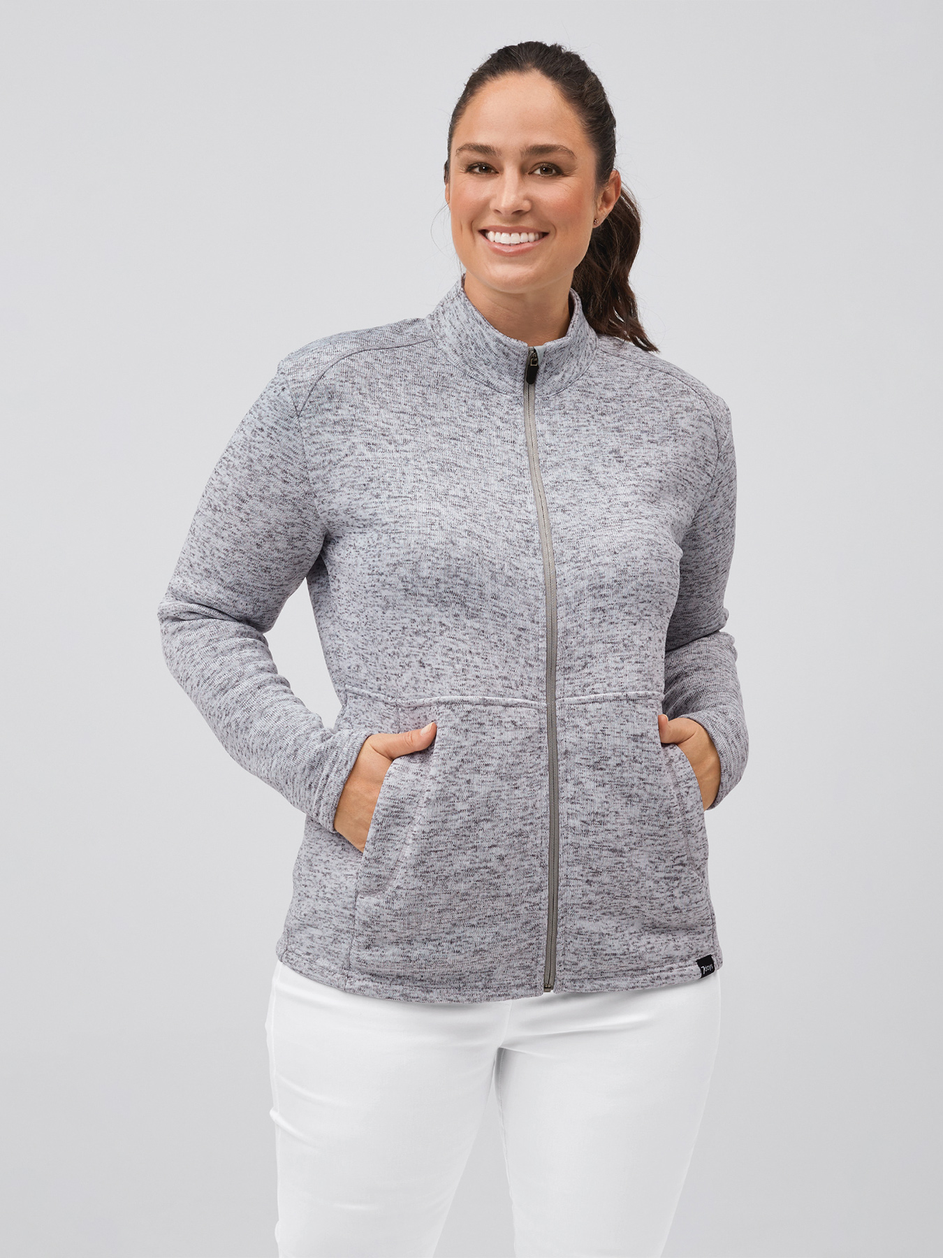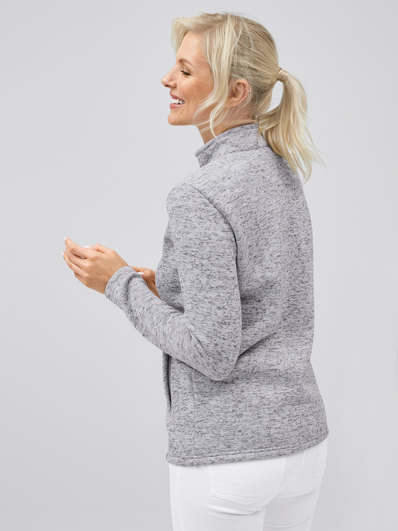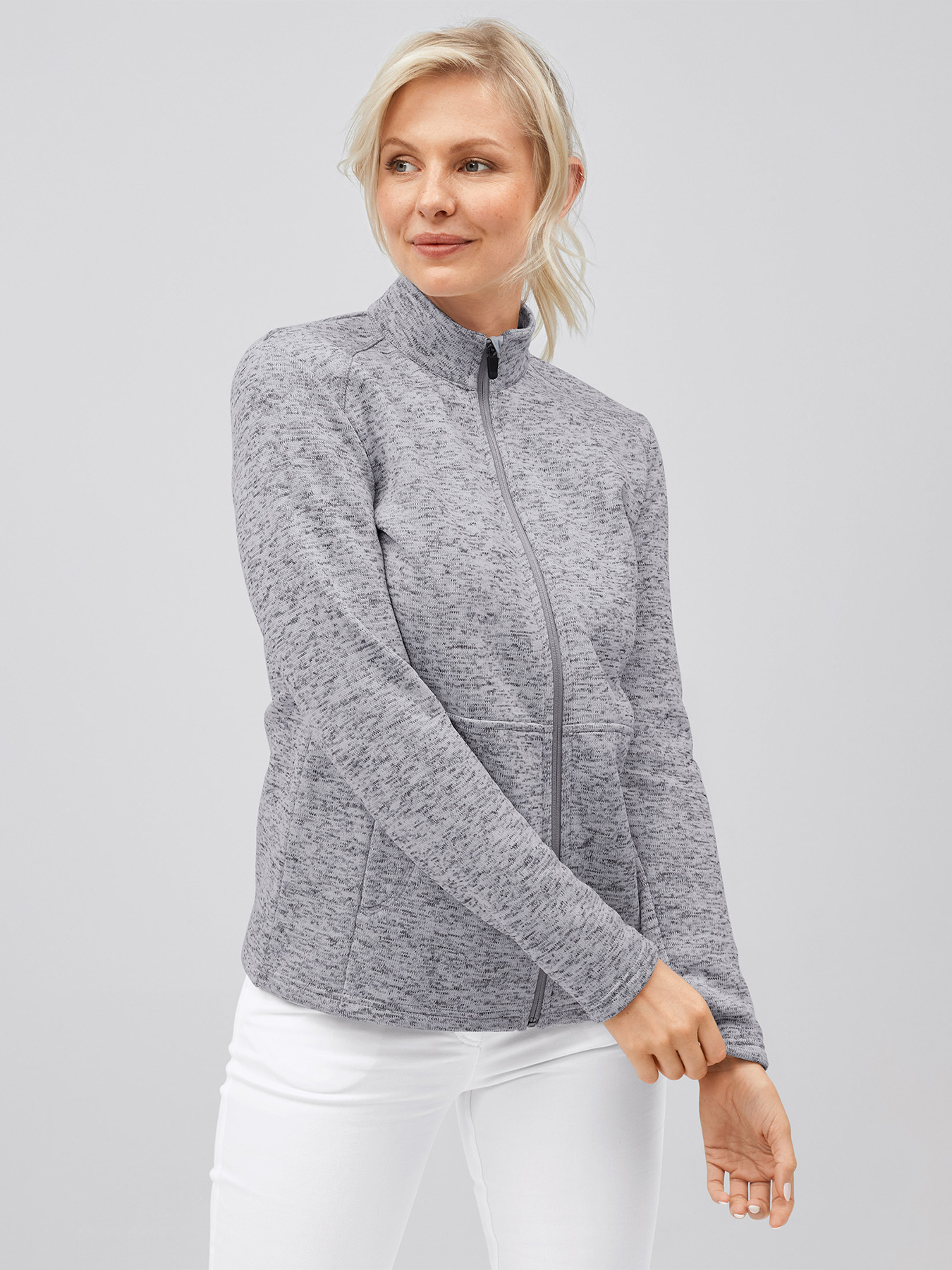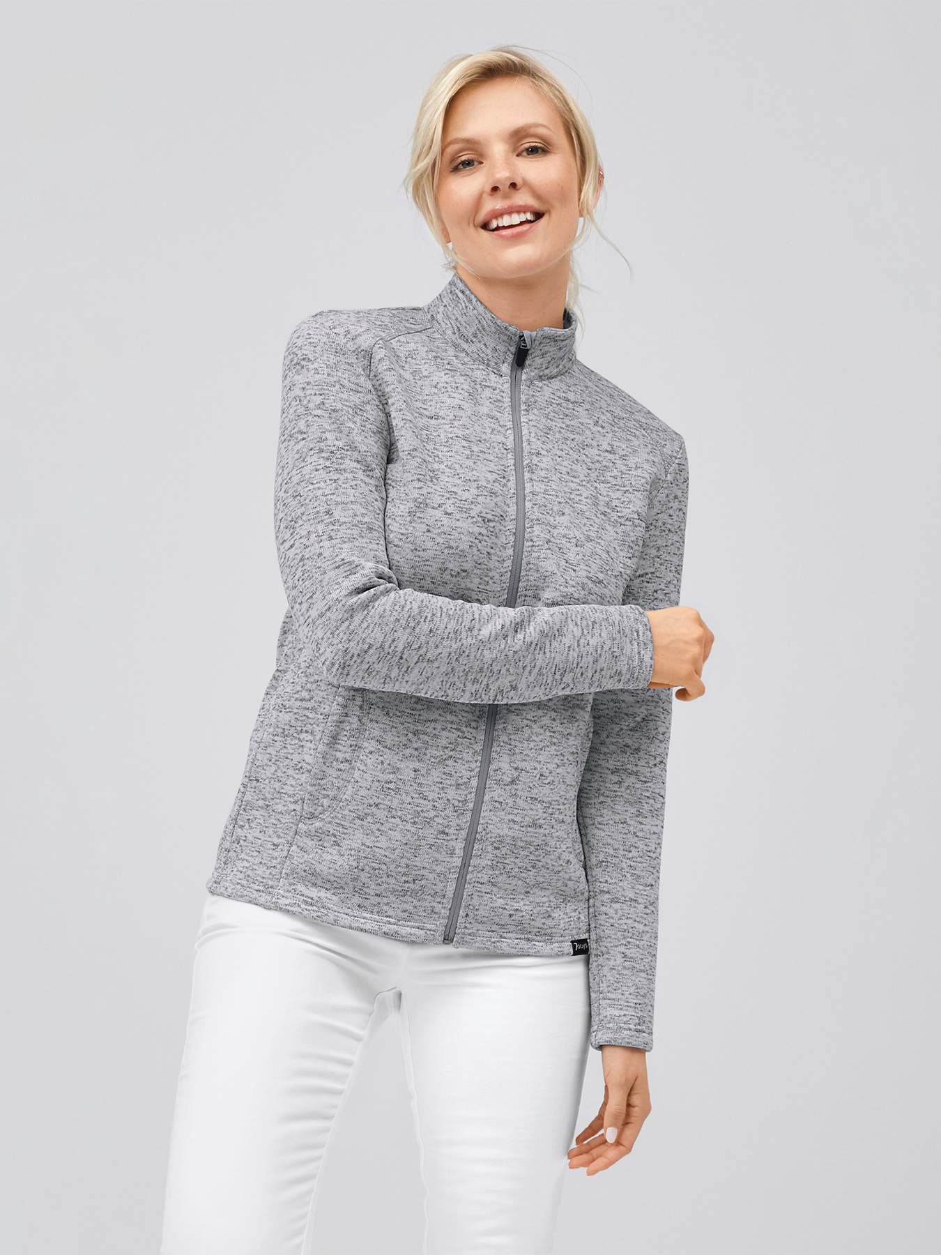 Hochwertige Damen-Strickfleecejacke mit Zipper, seitlichen Reißverschlusstaschen und Stehkragen, gerade geschnitten, regular fit. Zwei große Innentaschen in der ein Handy oder ein kleiner Block Platz finden. Rückenlänge Gr. S ca. 64 cm. Super weiches, wärmendes Strickfleece-Material aus 100% Polyester, 300 g/m², 40°-Wäsche.